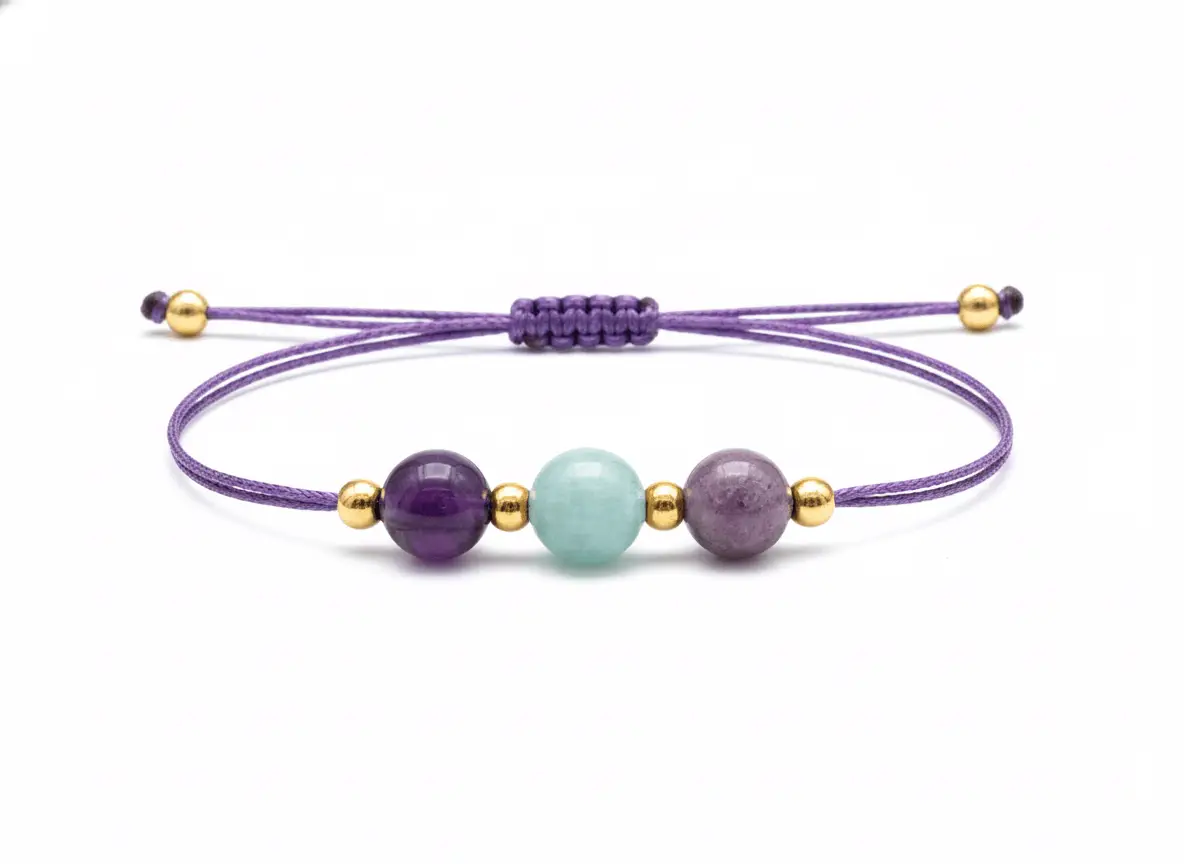 Ametist, Amazonit ve Lepidolit’in sakinleştirici enerjisini bir araya getiren antistres bileklik. Zihinsel ve duygusal denge arayanlar için özel olarak tasarlandı.